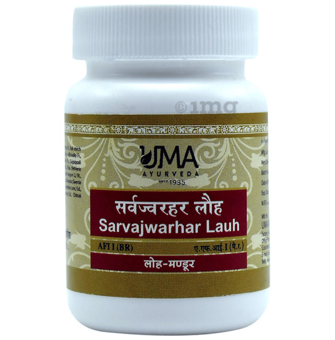 Uma Ayurveda Sarvajwarhar Lauha Tablet is an ayurvedic product that is beneficial to manage body temperature, weakness, immunity, and fever. It is useful for malaria, viral infections, and recurrent fevers. This is beneficial in cases of fever for any reason. It helps to increase haemoglobin levels. It can alleviate coughing, provides energy, and detoxifies the body. It can be used as an iron source because it contains Iron calx (Bhasma) as a component. It is antibacterial and tonic in nature.