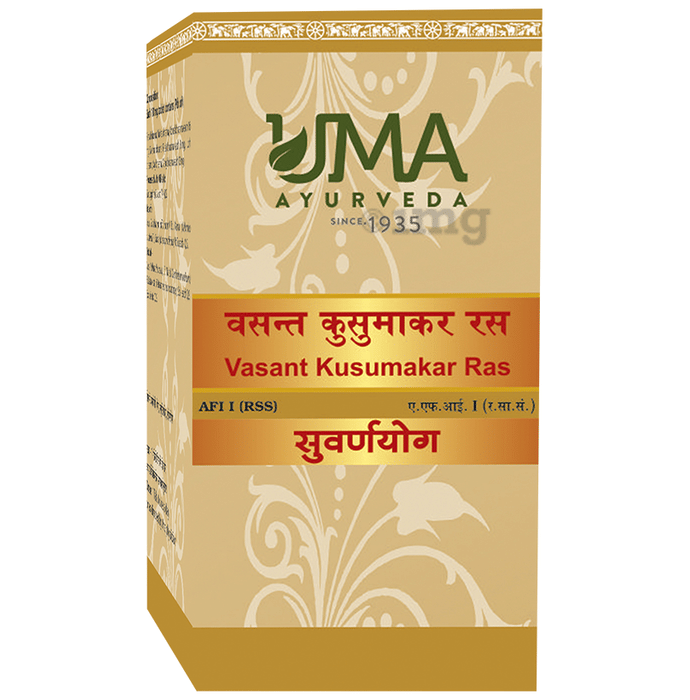 Uma Ayurveda Vasant Kusumakar Ras Tablet (with Gold & Silver) is a classical ayurvedic formulation used to boost immunity and maintain vitality and stamina. Its therapeutic properties help to overcome mental and physical weakness and correct general debility associated with the disease. It also has a cooling effect on the body and fights burning feet syndrome.