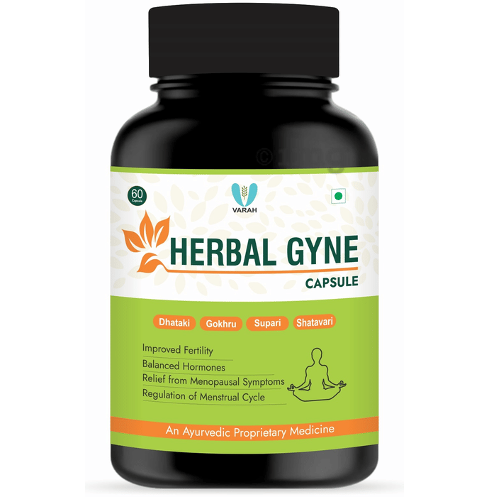 Varah Herbal Gyne Capsule is an Ayurvedic formulation that may help to enhance women's health. It may help reduce physical weakness and boost energy levels and vitality. It may also help in healthy weight management and strengthen muscles. This supplement may also help reduce gas-related stomach pain and improve the digestive system functioning.