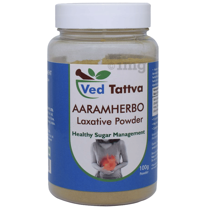 Ved Tattva Aaram Herbo Laxative Powder is an ayurvedic formulation of senna leaves, amla, ajwain, himej, jethimadh, nisot and black salt. It contains laxative properties and helps relieve constipation.