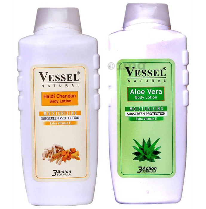 Vessel Combo Pack of Natural Moisturizing Body Lotion with Sunscreen Protection Aloe Vera & Haldi Chandan contains two lotions that help to keep the skin moisturised. They are suitable for all skin types.