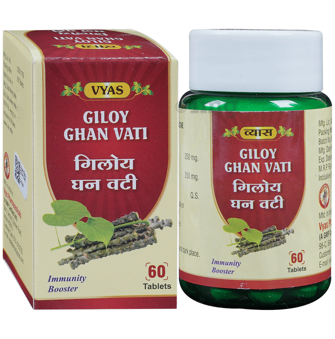 Vyas Giloy Ghan Vati is an herbal formulation that serves as a natural immunity booster and supports digestive health. Giloy (Tinospora cordifolia) is beneficial for general weakness and high body temperature.