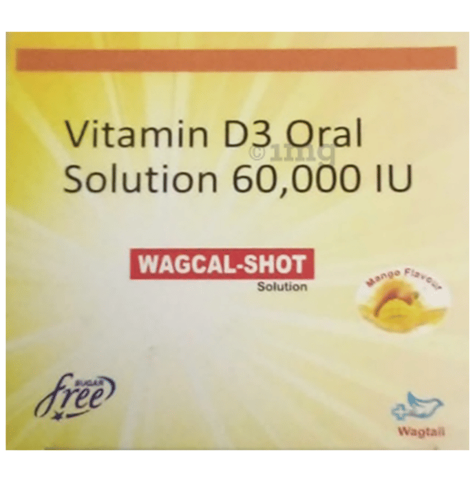 Wagcal-Shot Solution (5ml Each) Mango Sugar-Free is a vitamin D supplement in liquid form that helps maintain overall health. It supports various physiological processes in the body.