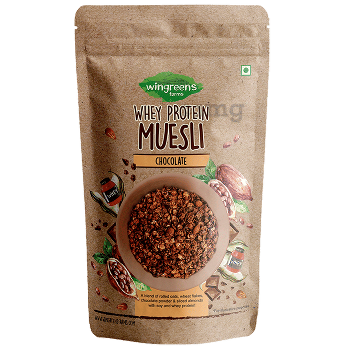 Wingreens Farms Whey Protein Muesli Chocolate provides you and your family a tasty start to the day with Wingreens Farms Whey Protein Chocolate Muesli. It helps you have a filling start to your day, being a rich source of Vitamins, Calcium and Fibre. Relish this muesli with cold or warm milk and get a nutritious crunch with every spoonful! So go ahead and buy Wingreens Farms Whey Protein Chocolate Muesli online today.