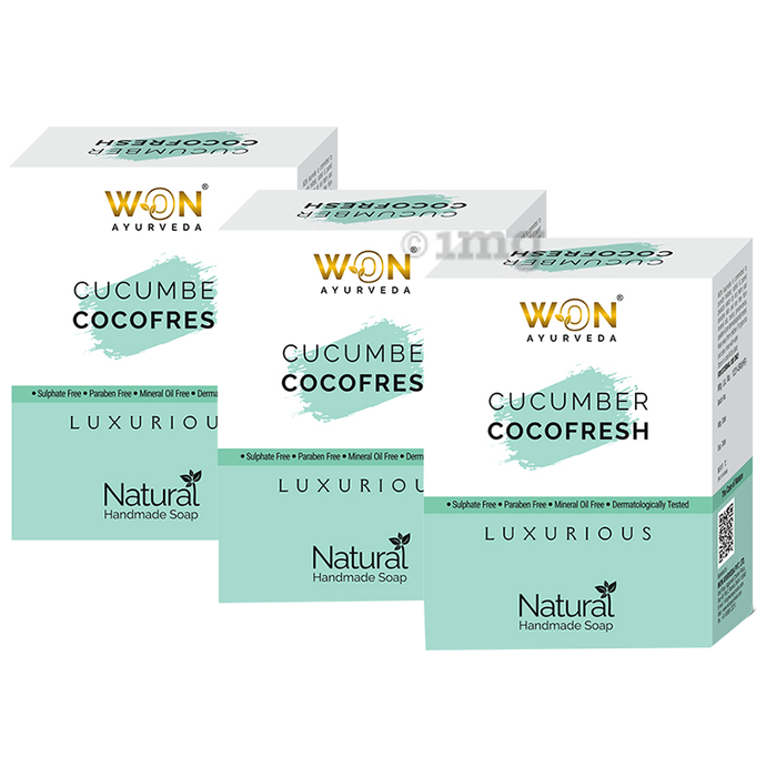 Won Ayurveda Cucumber Cocofresh Natural Handmade Soap (100gm Each) is a mild, safe and pure handmade soap that may not harm sensitive skin. It is free from mineral oils, toxins, preservatives, and paraben. This soap is sulphate-free and is dermatologically tested.