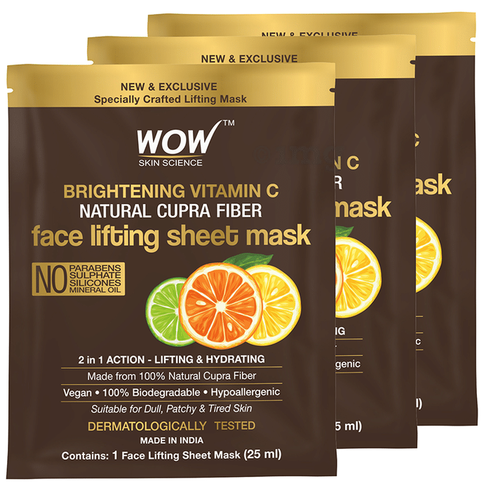 WOW Skin Science Brightening Vitamin C Natural Cupra Fiber Face Lifting Sheet Mask (25ml) helps in hydrating and lifting your skin. It is suitable for dull, patchy, and tired skin. It is infused with radiance-boosting and refreshing goodness of active vitamin C, lemon oil, and orange oil. It helps to protect skin from oxidative damage and even out patchy skin. The active ingredients help to moisturize the skin, reduce fine lines and brighten the complexion. It gives your skin a soft, clear, and luminous glow. It is a two-piece mask made from natural cupra fibre made from special recycled material and is sustainable and biodegradable. This super-soft mask allows the skin to absorb the serum almost completely. The unique chin strap holds a sagging or double chin that helps define the jawline
