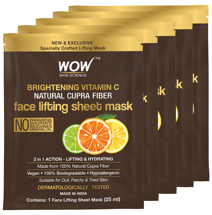 WOW Skin Science Brightening Vitamin C Natural Cupra Fiber Face Lifting Sheet Mask (25ml) helps in hydrating and lifting your skin. It is suitable for dull, patchy, and tired skin. It is infused with radiance-boosting and refreshing goodness of active vitamin C, lemon oil, and orange oil. It helps to protect skin from oxidative damage and even out patchy skin. The active ingredients help to moisturize the skin, reduce fine lines and brighten the complexion. It gives your skin a soft, clear, and luminous glow. It is a two-piece mask made from natural cupra fibre made from special recycled material and is sustainable and biodegradable. This super-soft mask allows the skin to absorb the serum almost completely. The unique chin strap holds a sagging or double chin that helps define the jawline