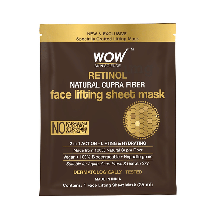 WOW Skin Science Retinol Natural Cupra Fiber Face Lifting Sheet Mask is a specially crafted sheet mask that delivers the 2-in-1 action of hydrating and lifting your skin. It is suitable for acne-prone, uneven and ageing skin. It is infused with the anti-ageing and repairing goodness of retinol and bakuchi extract. It helps to improve the skin’s renewal process and repair skin damage. The actives help to boost collagen levels, reduce fine lines, and even out complexion. It helps give the skin a soft, youthful, and glowing appearance. It is meant for night use only. It is a two-piece mask made from natural Cupra fibre that uses special recycled material and is sustainable and is biodegradable