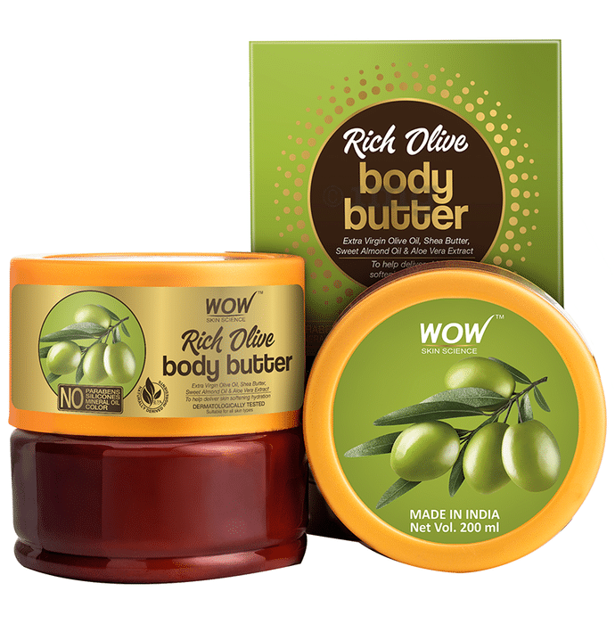WOW Skin Science Rich Olive Body Butter has a creamy formulation and is infused with extra virgin olive oil, shea butter and sweet almond oil that give your skin complete nourishment. It helps to restore healthy radiance and suppleness to the skin. This butter is ideal for aiding you with dry, sensitive, irritation-prone skin. It soothes and calms irritated skin and helps to repair skin damage. It helps to hydrate skin visibly. Vitamins A, B, D and E in this lush butter strengthen the collagen structure, improving the skin’s texture and appearance. Antioxidants in olive oil and sweet almond oil help to protect the skin from UV rays and environmental pollutants and keeps the skin moisturised. This skin-softening, creamy body butter spreads easily and gets absorbed into the skin so that your skin can breathe yet remain amply nourished.