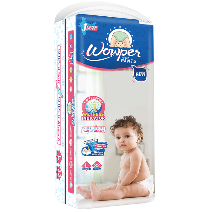 Wowper Fresh Pants New Large (32 Pieces Each) are the only pant style diaper in India with new airflow material providing your baby a fresh night. Keep your baby feeling dry and comfortable with this lightweight diaper. It has 360 degrees super soft and super absorbent and stretchable waist band. It prevents leakage the whole night till morning.