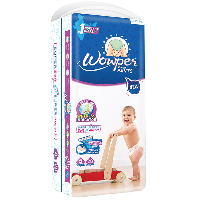 Wowper Fresh Pants New XL are the only pant-style diapers in India with innovative airflow material, ensuring a fresh sleep for your baby. This lightweight diaper will keep your baby dry and comfy. It features a flexible waistband that is 360 degrees incredibly soft and absorbent. It stops leaks throughout the night and into the morning.